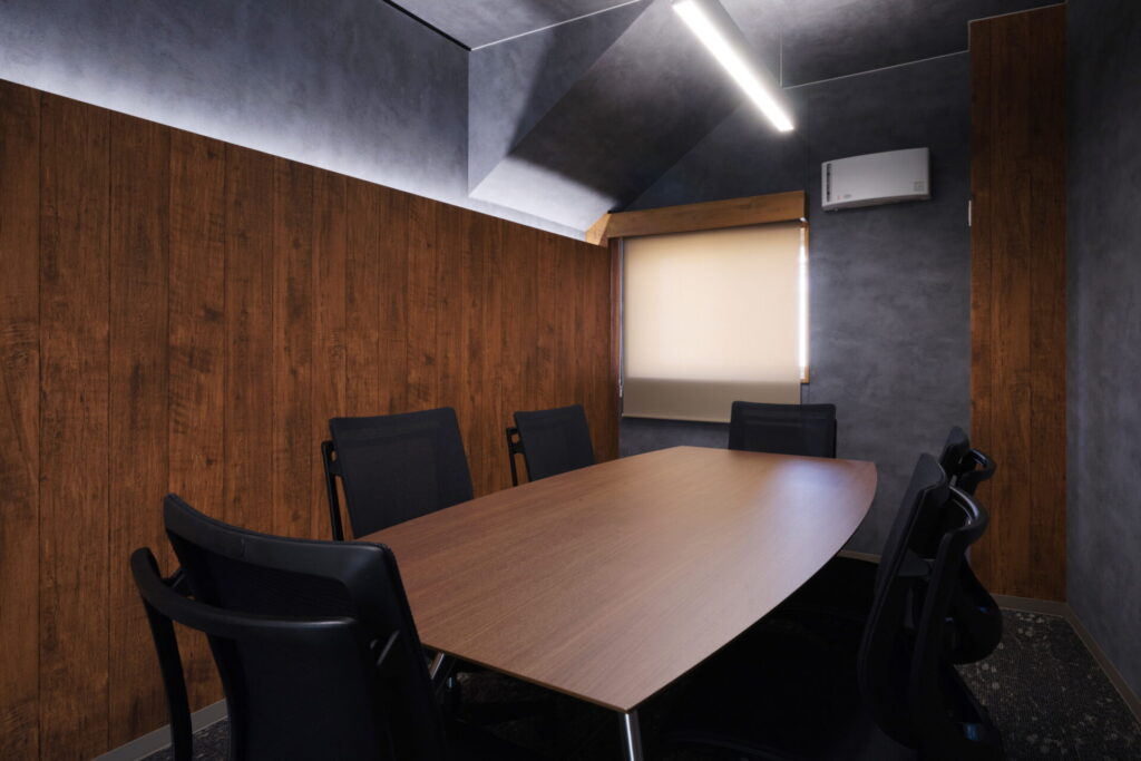 落ち着きのあるレセプションルーム(応接室)。他とは違うダーティ空間がミーティングの集中力を高め、建設的な議論が生まれることを意図しています。